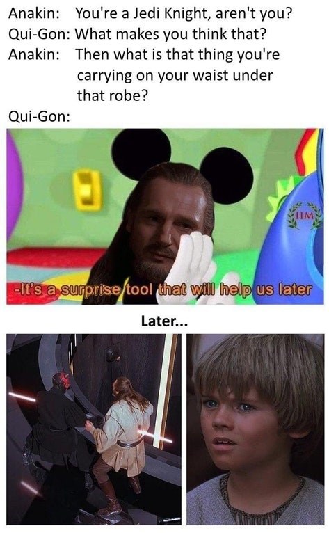 The meme generally keeps the image of mickey saying the line it s a surprise tool that will help us later while the caption indicates that the surprise tool is something offensive violent or outside the realm of the disney universe.