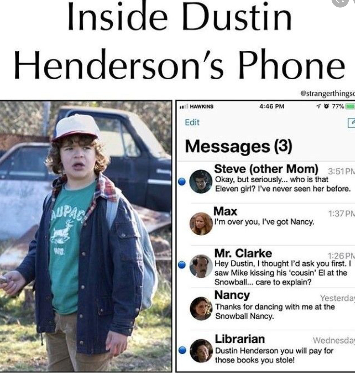 Another meme comparing steve to a mom steve is just a young man himself yet him took on caring for the kids especially dustin as if he were a big brother. These stranger things 2 memes are almost better than the show itself. Eleven and mike became official priah ferguson got a way bigger role as erica sinclair and robin steve and dustin provided some major scoops troop laughs. Nov 6 2017 9 00 am est netflix. Stranger things returned july 4 for season 3 and this season s adventures inspired plenty of memorable and meme worthy moments. Dustin in stranger things duration. These stranger things 3 memes will completely destroy you.