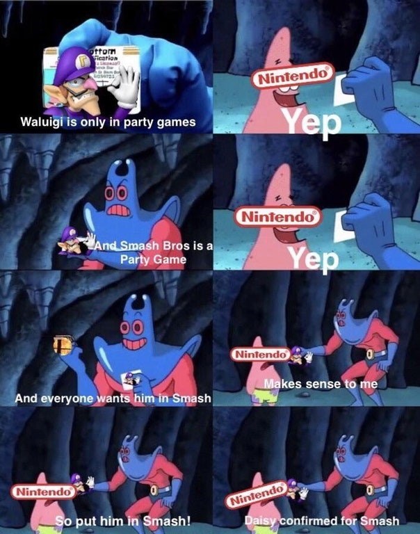 Nintendo memes duration. Despite waluigi s popularity gain as an internet meme he has yet to appear outside of mario spin offs most notably being his lack of playability within super smash bros. Meme status submission type. Super smash bros ultimate meme compilation. Waluigi s smash snub refers to jokes about noted super mario character waluigi being absent from the upcoming super smash brothers video game super smash bros. Character year 2018 origin nintendo tags super smash bros super smash bros switch super smash bros 5 super smash bros ultimate waluigi about. Ultimate confirmed when the character was announced as a non playable assist trophy during e3 2018 which was met with negative reception from the gaming press and social.